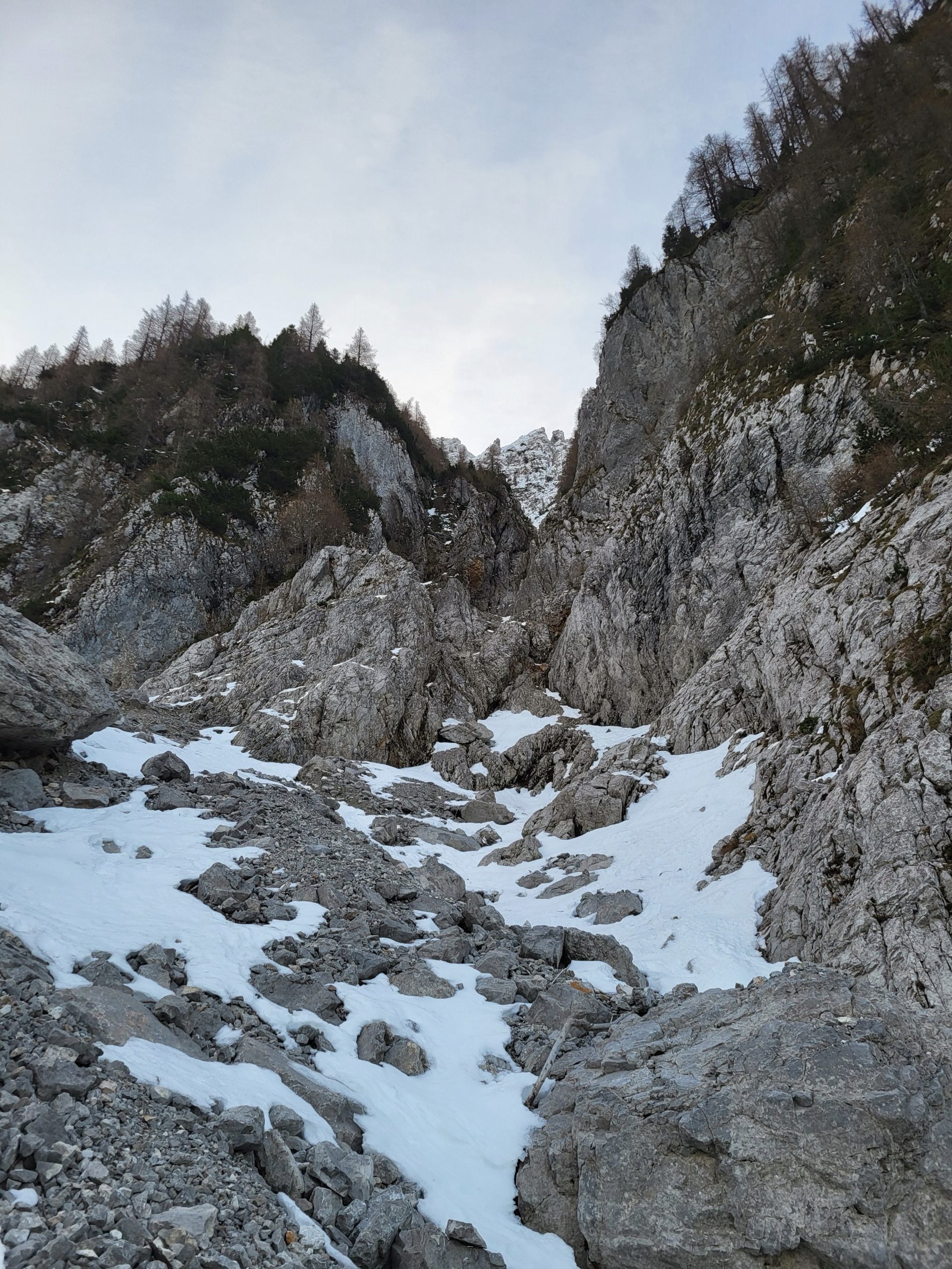 Danes, v soboto, sva šla z Blažem malo pogledat za kakšno plezarijo. Izbirala sva med Teranovo in Kramarjevo. Potem sem jaz rekel, da bi šla v Storžič, ker me je zanimalo kako je tam. Odpravila se do Doma pod Storžičem, kjer še ni ne duha ne sluha o snegu. Začneva hodit, na melišču je nekaj snega in marsikateri stop se celo ne predre. Štartava v smer najprej brez vsega, potem se navežava in ko končno prideva na sneg se še opremiva z zimsko bojno opremo.