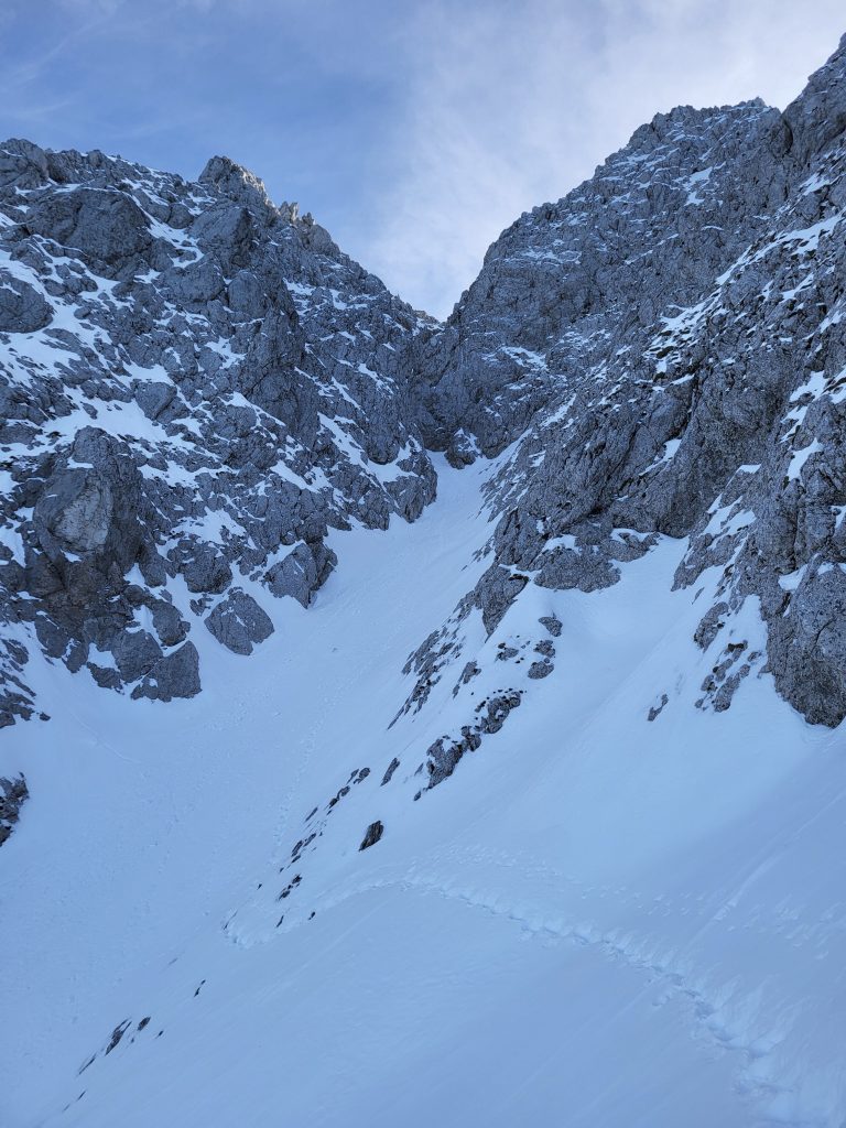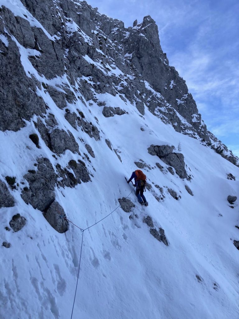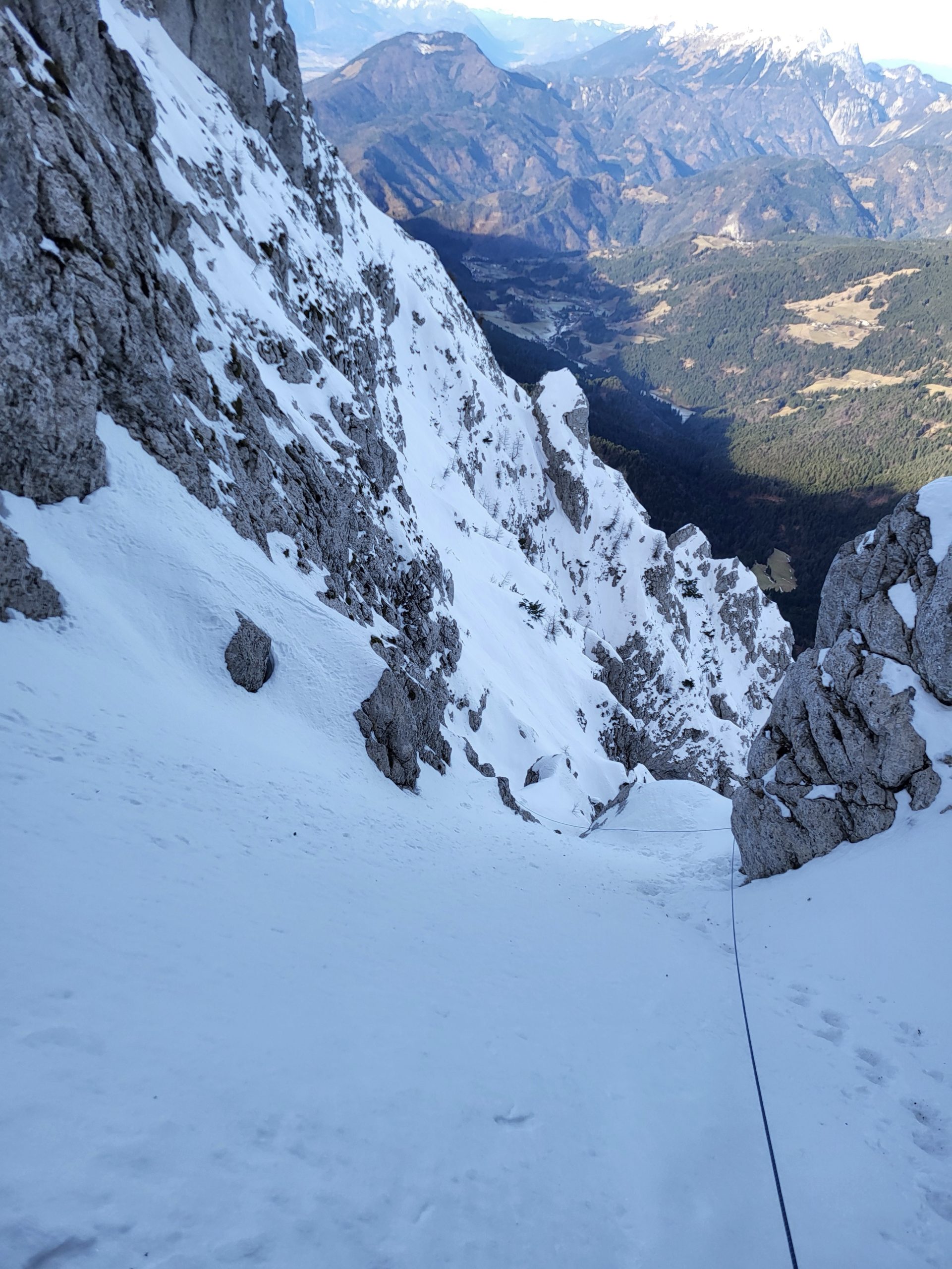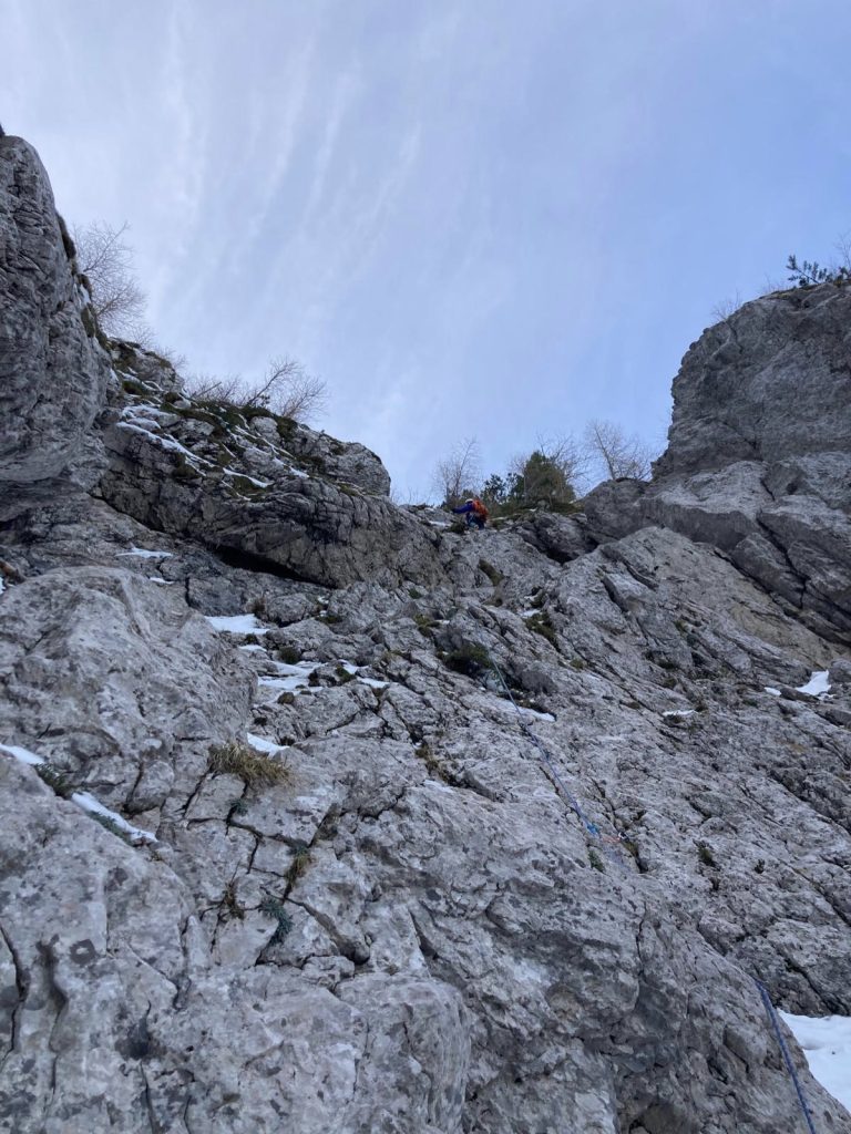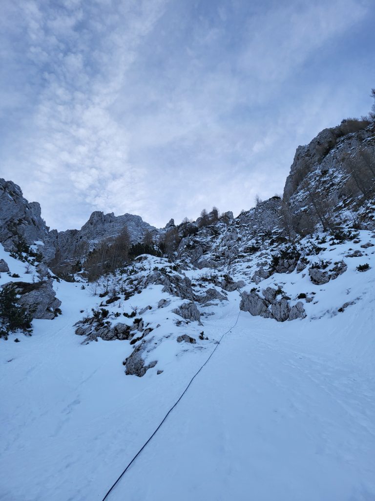 Potem pa se začnejo dokaj “luštne” razmere. Sneg je večinoma lepo predelan. Na vsake toliko časa se za varovanje najde kakšen klin in tudi dva svedrovca, pa še kakšnega frenda se da uporabit. Je pa treba tudi dvakrat malo popraskat po skali.