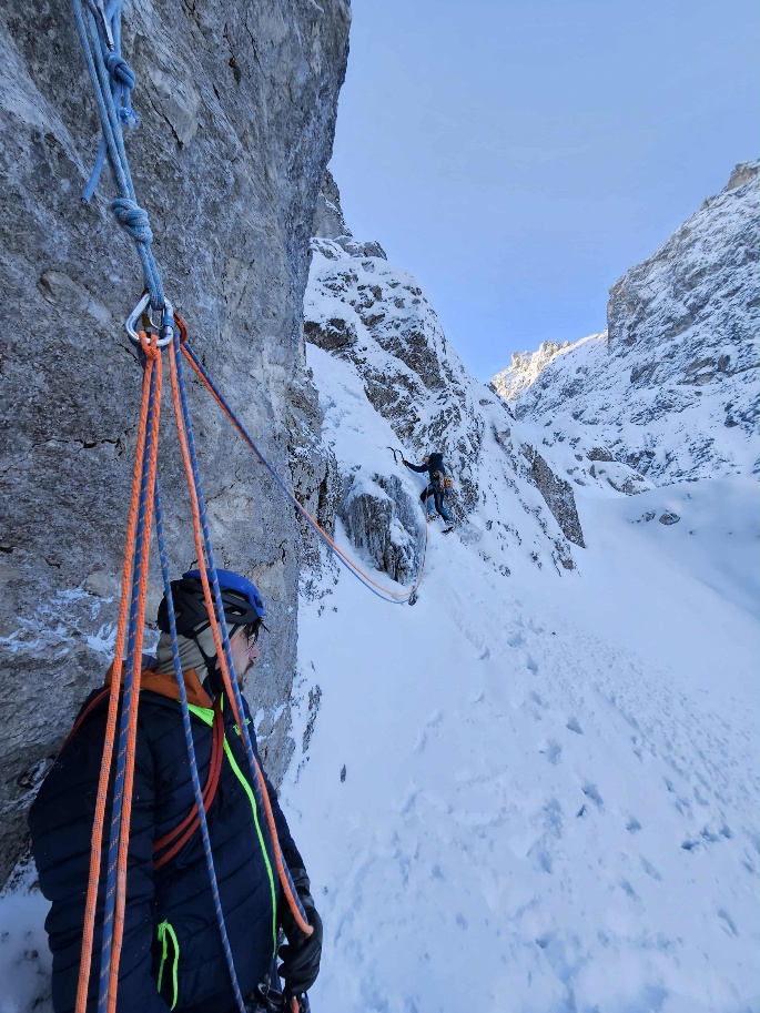 Začnemo plezat. Prvi raztežaj je bil kar strm in je že malo teklo, bil sem tudi že malo moker ampak ni sile. Sledijo trije raztežaji malo položnejšega sveta. Plezanje je dokaj tekoče tudi zaradi lepo urejenih sidrišč. Pridemo do predzadnjega sidrišča, kjer se z še eno slovensko navezo zmenimo, da bomo skupaj abzajlali (Črt, če to bereš še enkrat oprost ampak, če smo si pa takrat kaj želeli pa je bila to čimprejšna toplota v dolini).