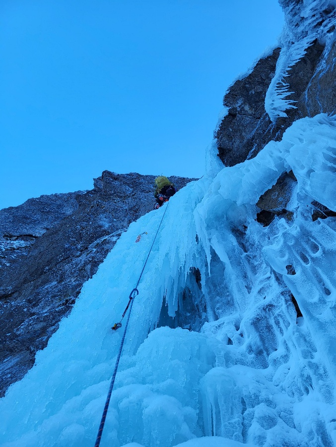 In sedaj ta zadnji raztežaj, od tistega prvega sem se že posušil. Od njega je kar teklo, če si imel odprta usta, žejen sigurno nisi bil. Vmes sem že dobival idejo kako bi bilo plezat z dežnikom. To da je navpično sem kar pozabil. Dobro je pa bilo, da je šel vsaj cepin v led kot v maslo. Pridemo na vrh in se kar se da hitro abzajlamo v dolino, saj nas kar vleče tja do avta, kjer imamo imamo še kaj suhega.