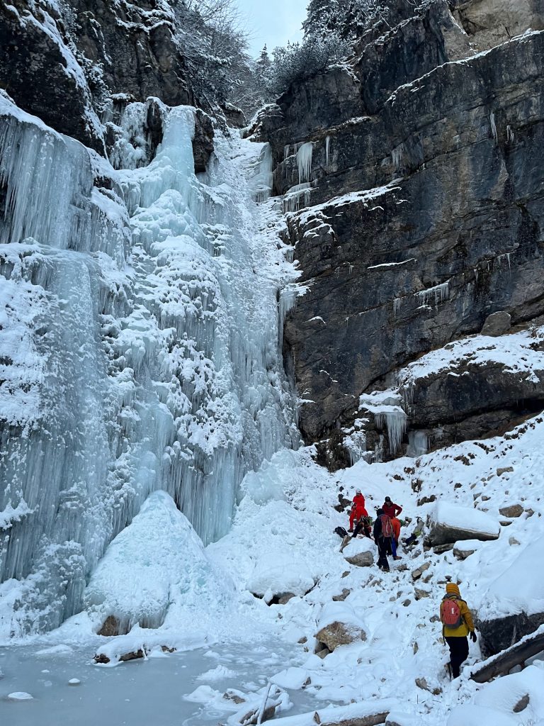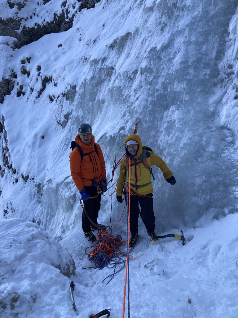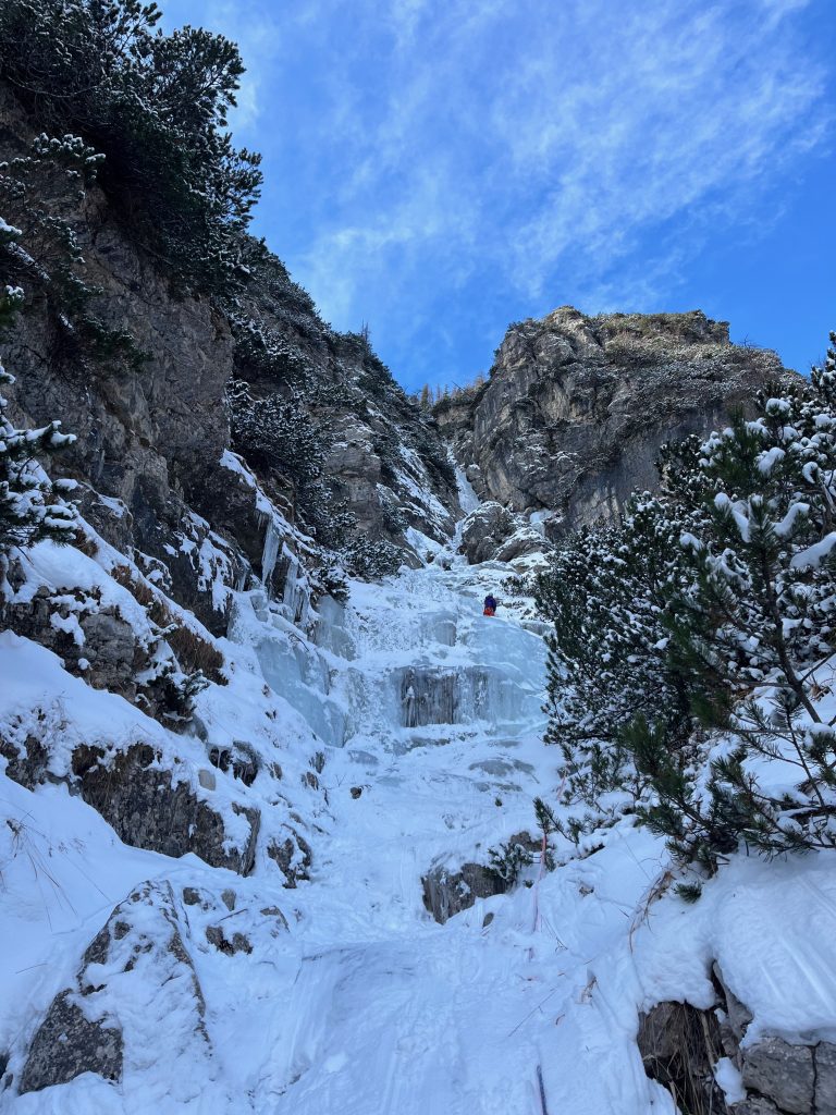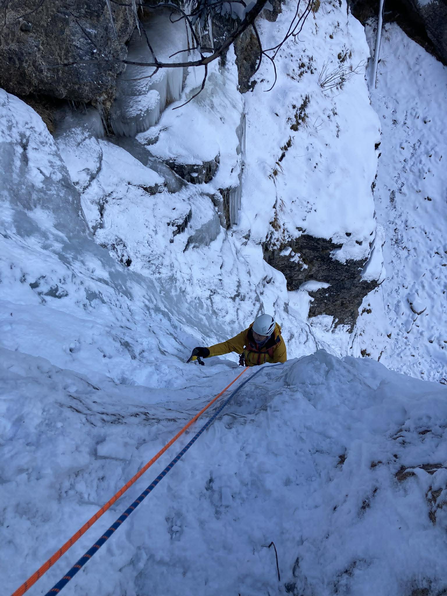 Po dobri uri čakanja in uživanja v prijetnem ambientu se končno ledu lotimo tudi sami. Blaž suvereno prepleza prvi raztežaj, ki mu sledi lažji teren po strugi potoka kjer se moramo odločiti za desni ali levi krak. Po spominu se Blaž odpravi v desno, a se vrne nazaj saj tam sreča italijansko navezo, ki je začela pred nami in se vrača, češ da ta smer ni prava. Nato poskusimo v levo, ampak po preplezanem raztežaju se z enim abzajlom obrnemo saj tam ni nič. Vmes berem poročila plezanja slapu z ostalih odsekov, v enem od njih se je navezi vdrl led na tem delu potoka in sta se skopala v tolmunu, zato vnaprej hodimo bolj previdno. Skupaj še z navezo za nami, ki nas do takrat dohiti, ugotovimo da mora biti vseeno pravilna pot v desno. Po pol ure kobacanja po strugi potoka zares pridemo pod zgornji del slapu.